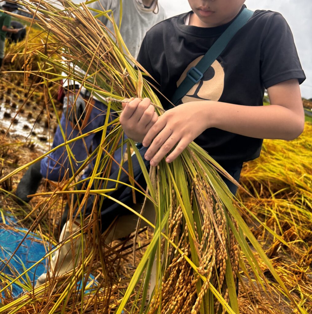 少しだけいただいた稲を校舎で干していると、「これ何?」と興味津々。もう少し乾いたら、みんなで脱穀体験をする予定です。稲がお米になる過程を知ることは、こどもたちにとって大きな発見になります。