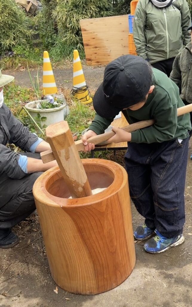 野菜の収穫を終えたあとは、みんなでお餅つきにも挑戦しました。「よいしょ〜!」の掛け声に合わせて、重たい杵を懸命に振り下ろすこどもたち。つきたてのお餅はとても柔らかく、「美味しい!」「おかわりしたい!」という声があちこちから聞こえてきました。