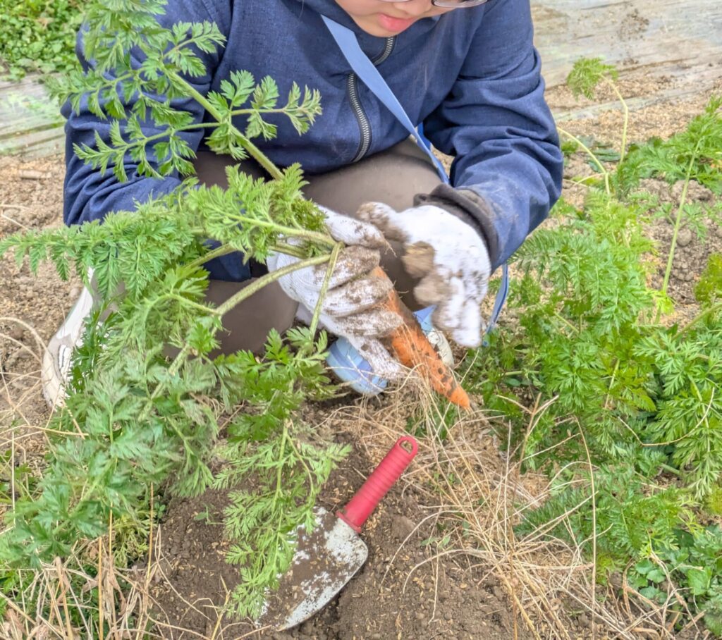 人参の収穫では、手やスコップを使って周りの土を丁寧に掘り、両手で力いっぱい引き抜きます。なかなか抜けず、掘っては抜きを何度も繰り返す場面もありましたが、ようやく人参が姿を現した瞬間、こどもたちは満面の笑顔を見せてくれました。