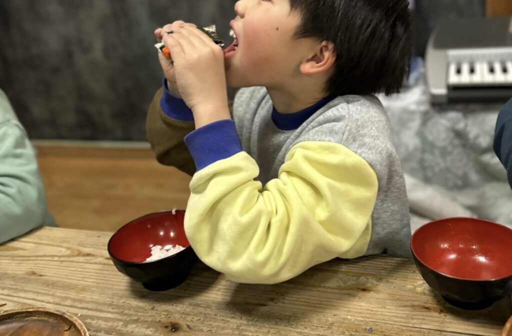 おやつの時間には「チャレンジおやつ」として、こどもたち自身で恵方巻作りに挑戦。節分の意味や、恵方巻の作り方について学んだあと、海苔の上にご飯と具材をのせ、くるくると丁寧に巻いて完成です。今年の恵方は「南南東」。みんなで方角を確認しながら、南南東を向いて恵方巻を味わいました。