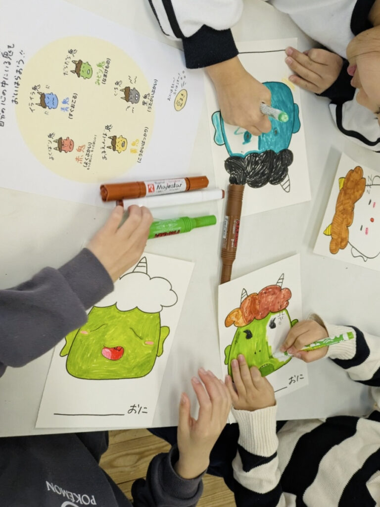 続いて、「五色の鬼」にちなんで、それぞれが心の中にいる「追い払いたい鬼」を紙に書き出しました。だらだら鬼、あまえんぼ鬼、めんどくさがり鬼……。その鬼に向かって、新聞紙で作った豆を投げながら「鬼は外、福は内!」と元気な声が響いていました。