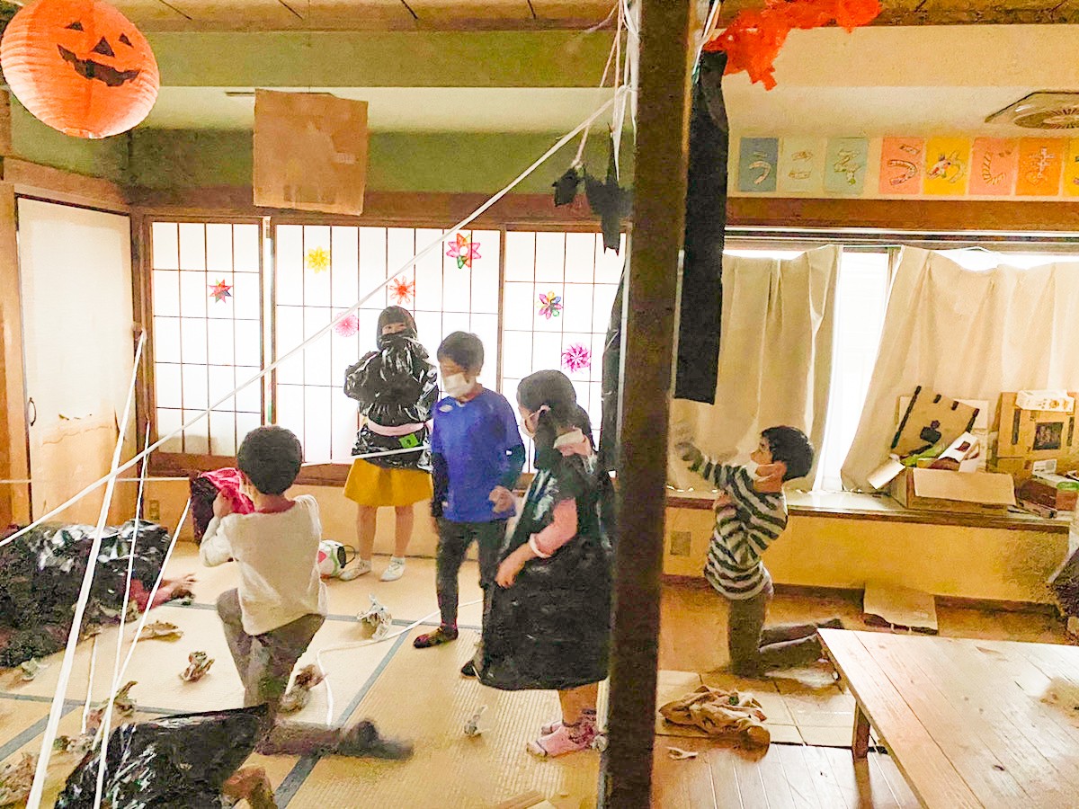 おやつを食べて宿題をさっと済ませるとパーティースタートです!まず最初は、お化け屋敷&蜘蛛の巣ゲーム。お化け屋敷チームはお化けに変身し、ダンボールの中に身を潜めます。そこへ他のチームの子達が体験しに来ると突如、ダンボールから「わあああ!!!」とお化けが出現!驚きながらも怖すぎないお化け屋敷を楽しむ様子がありました♪