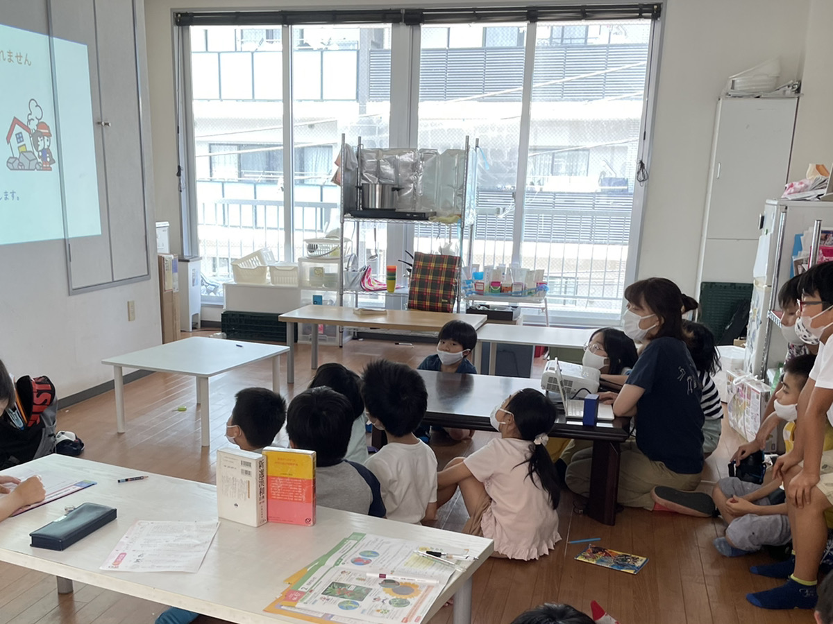 キッチンやコンセントの周りで発生しやすい火災から、安全に非難するための方法を学んだこどもたち。消防士から避難のポイントを解説してもらう動画を見た後、普段のように遊んでいる生活の中で、キッチンから火災が発生したことを想定した避難訓練を行いました。
