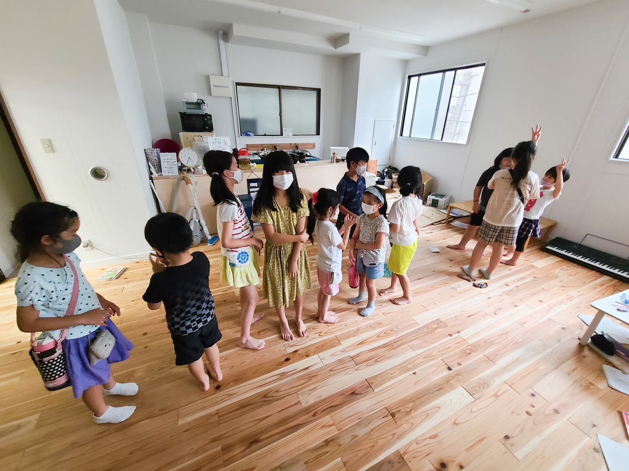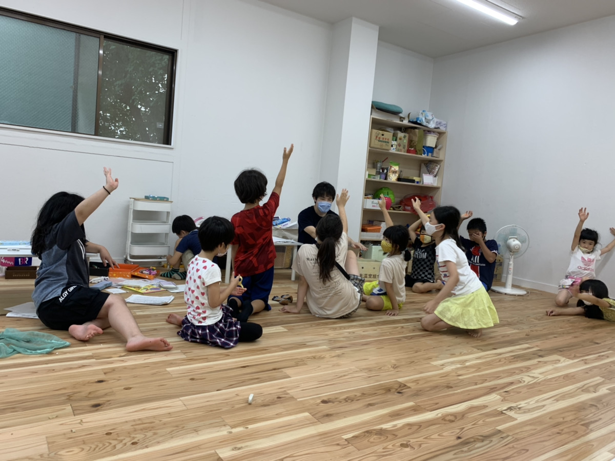 7月7日は、七夕イベントとしてみんなでゲームをして遊びました。最初に行ったゲームは、バースデーチェーンです。みんなで誕生日順に並ぶゲームですが、「しゃべってはいけない!」というルールが入ります。静かな空間ですが、ジェスチャーでなんとか伝えようと表情や大きな身振りで奮闘するこどもたち。上級生がお手本を見せたり、下級生をフォローしたりしてどんどん並んでいきます。そして真剣に伝え合った結果、バースデーチェーンは見事大成功!