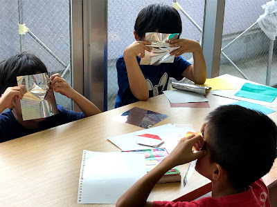 折り紙を目の前に何を作るか会議中のこどもたち。このシーン、実はかなり重要な話し合いでした。