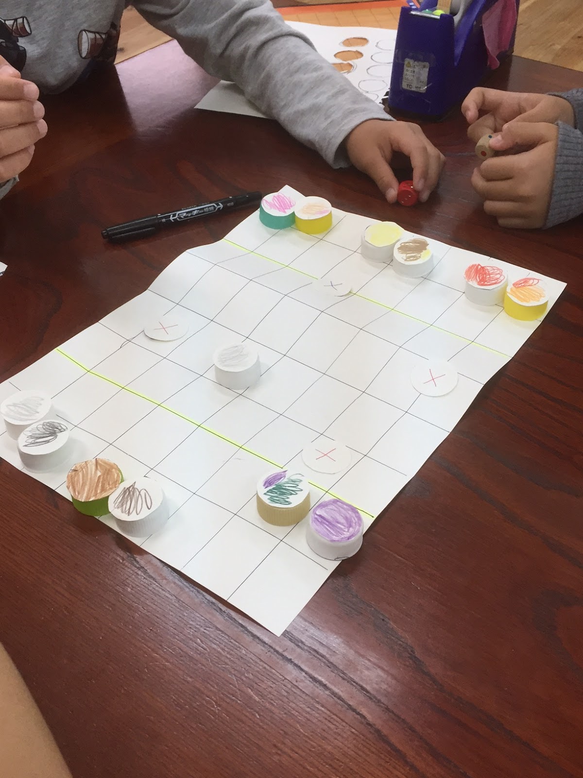 「斜めに進めるのもOK」などコマの進め方や、リーダーのコマを決め、相手のリーダーを先に取ったほうが勝ちになるというルールから、こどもたちが考えました。