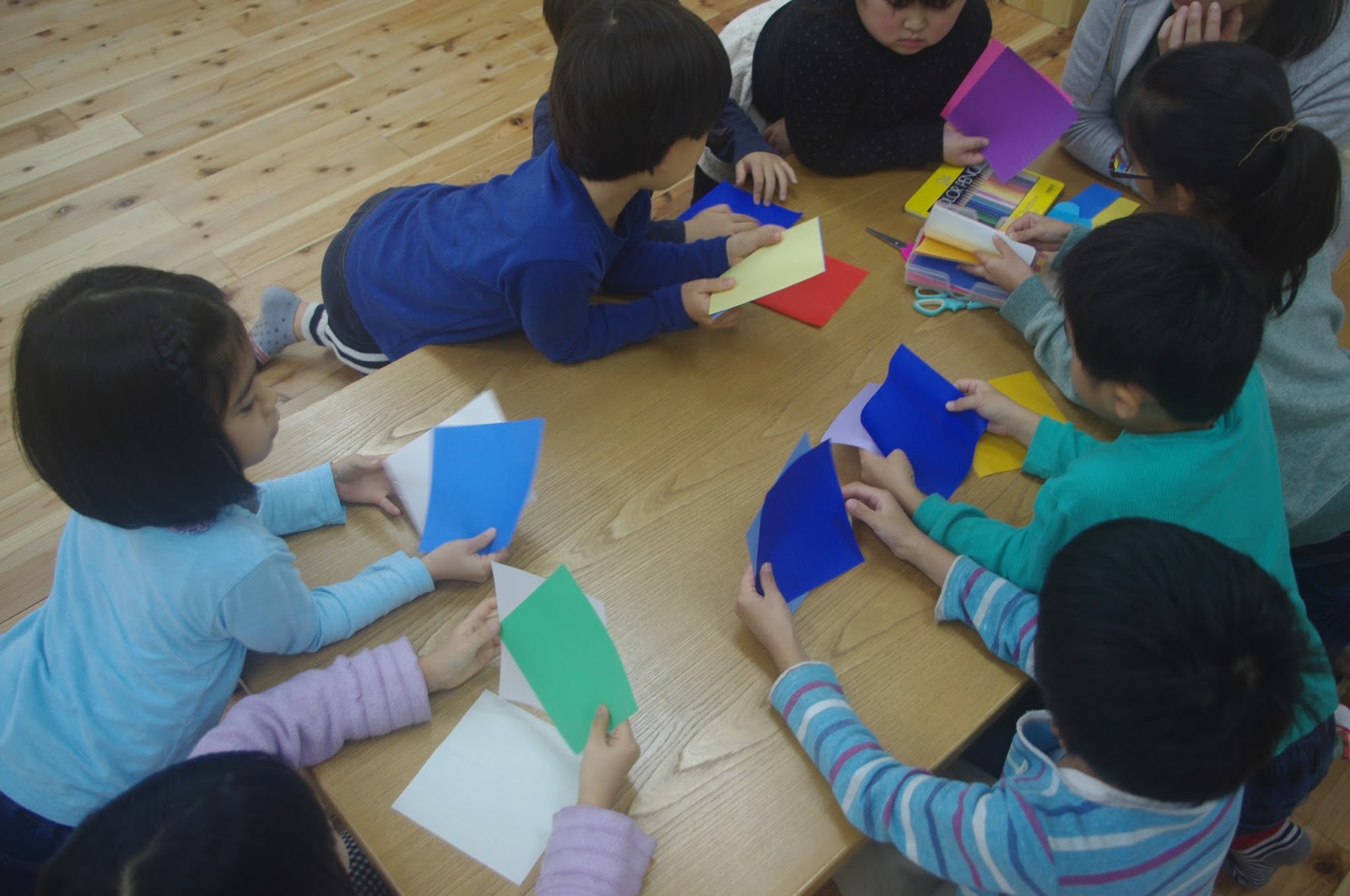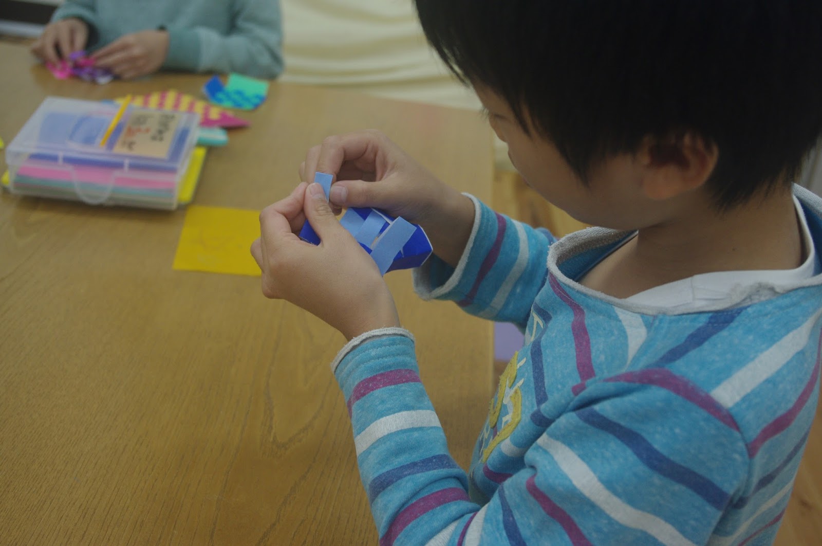 カードが出来たら次はメッセージカードを入れるケースを作ります。それぞれ渡す相手のことを考えながら好きな色の折り紙を選んでいます。こども達からは「この組み合わせでいいかな?」「この色喜ぶかな?」など一生懸命悩みながら決めていました。