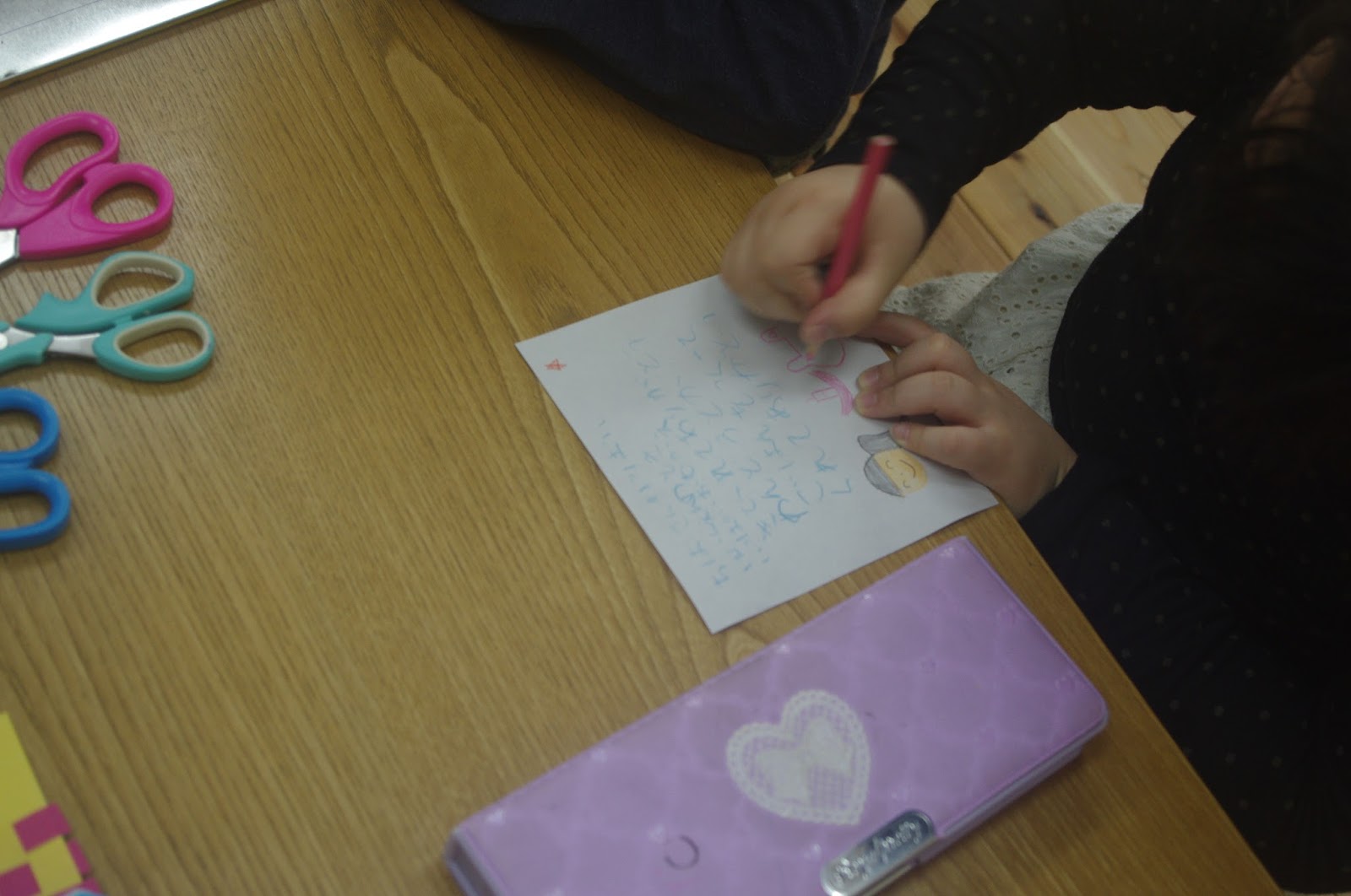 今日は、その中で一番お世話になっている人に感謝の気持ちを伝えるメッセージカードを作ります。メッセージカードを書く前に、こども達にはカードを渡す相手がもらった時に嬉しい言葉やどのようなカードだと喜んでくれるのか考えてから作業に取りかかってもらいます。こども達からは「ありがとうは絶対にいれる!」「ただ“ありがとう”だけだと何に対しての感謝か分からないから理由を書いたらいいよ!」など相手の喜ぶ顔を想像しながら感謝の気持ちをメッセージカードに込めていました。